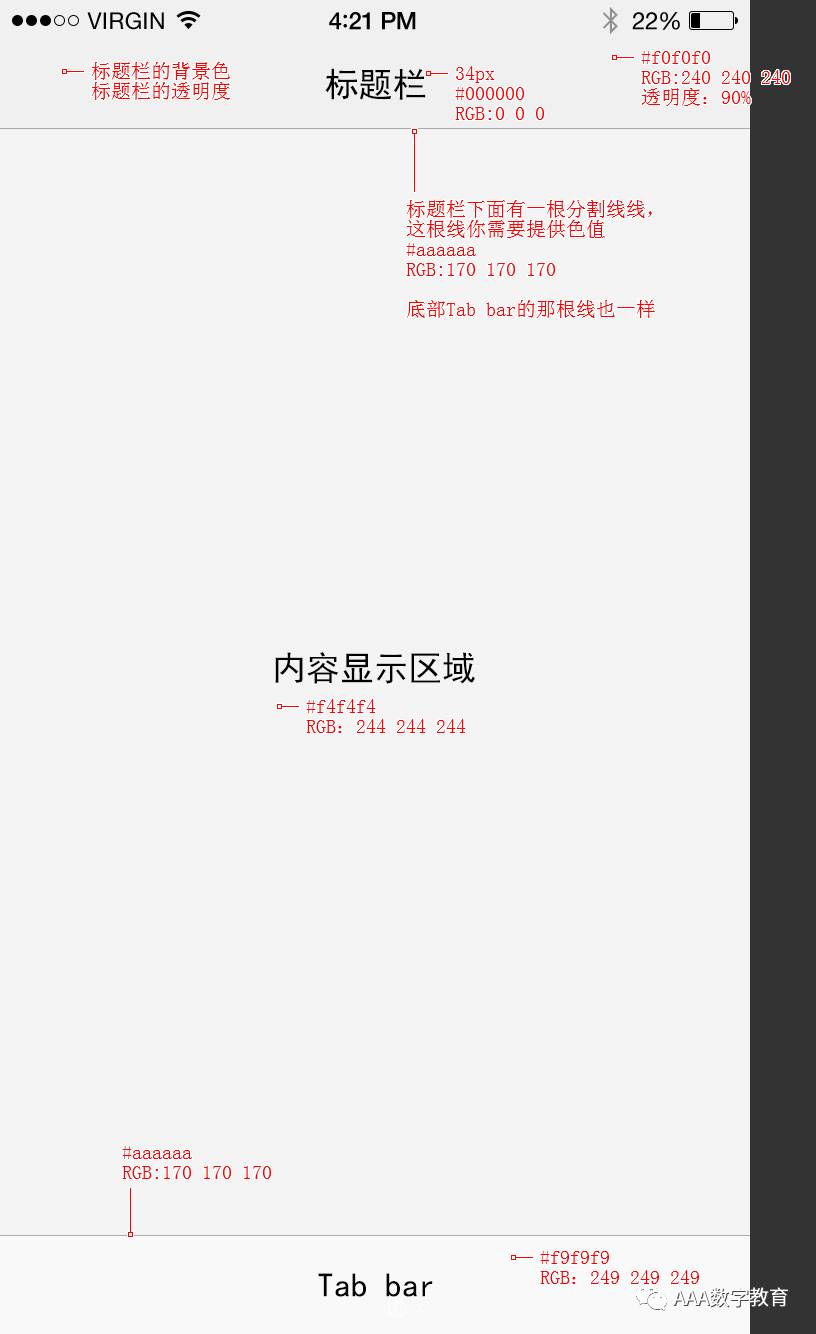 3.标题栏下方以及Tab bar上方其实有一条分割线,需要提供色值;