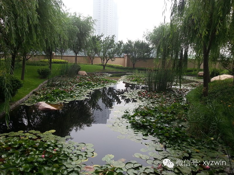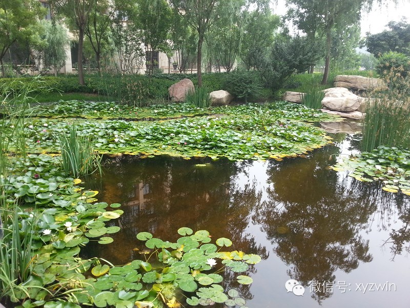 (8)水池、池岸景石自然驳岸或景石堆置和散置,其造型应体现自然,位置定点、石料选择、纹理、折皱处理应与环境、水面、绿地相协调。