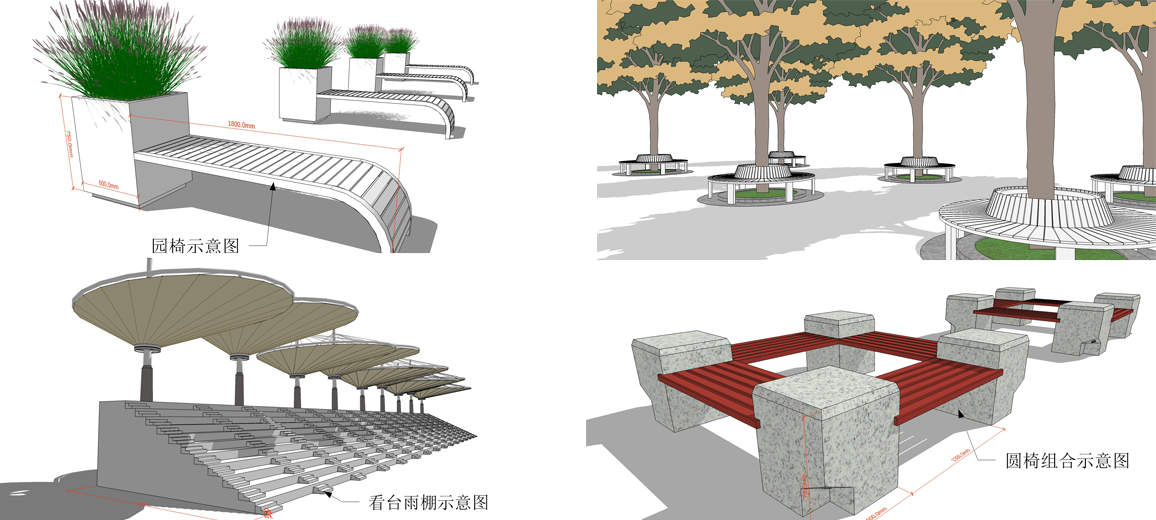 景观设计小景 花池绘画学习 景观园林椅子组合 遮阳看台制作